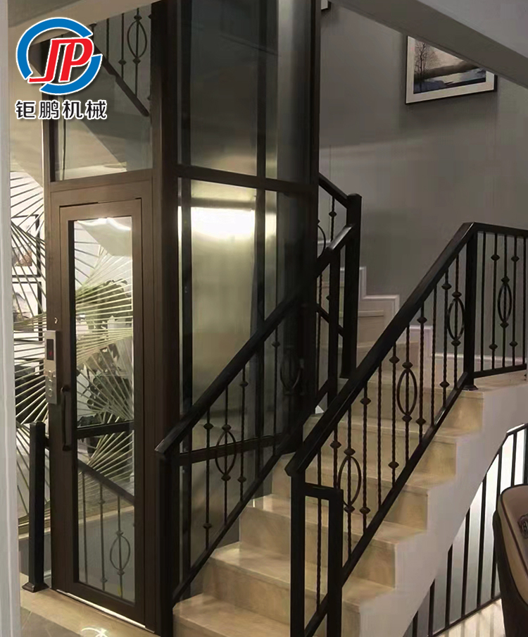 鉅鵬家用電梯以液壓泵站為動力,輸入380V或220v電源,電機轉動帶動油泵,將液壓油注入油缸,開始舉升平臺提升至預定位置,設有行程開關,自動停止。下降時,按下降按鈕設備自動下降,配電箱內設有電機延時保護。